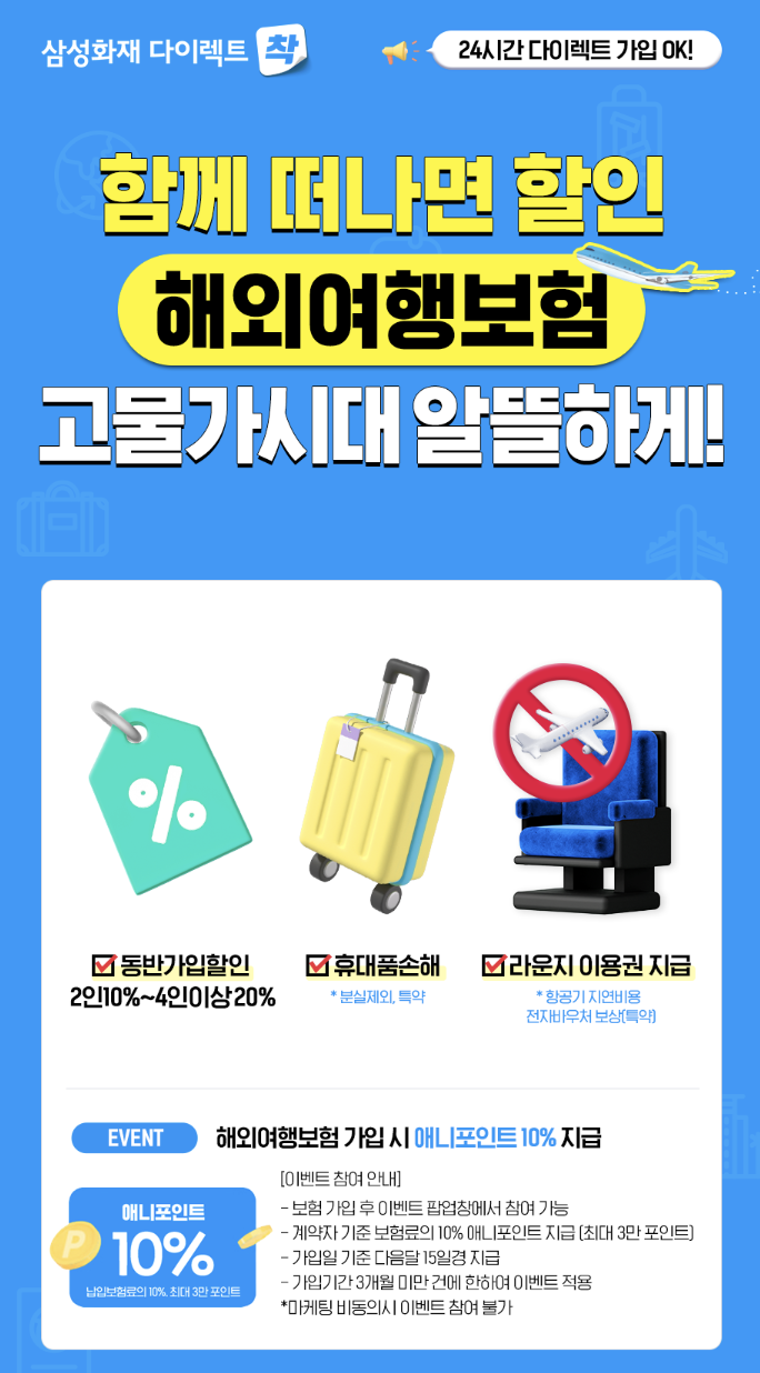 여행을 계획 중이라면 삼성화재 여행자보험을 통해 안전한 여행을 준비해 보세요.