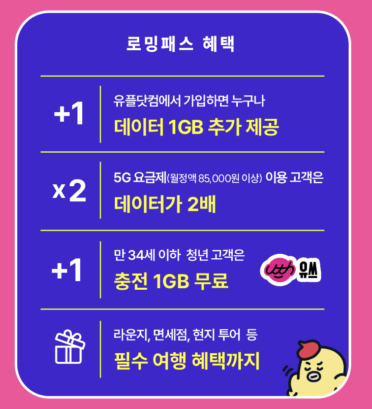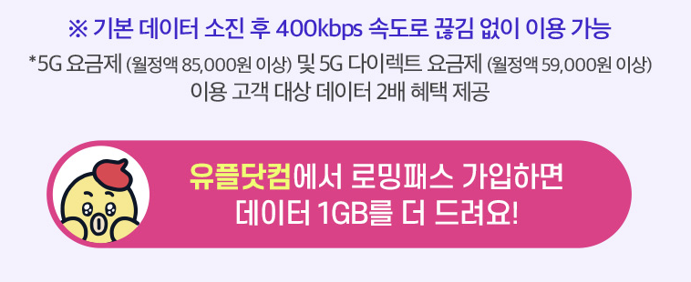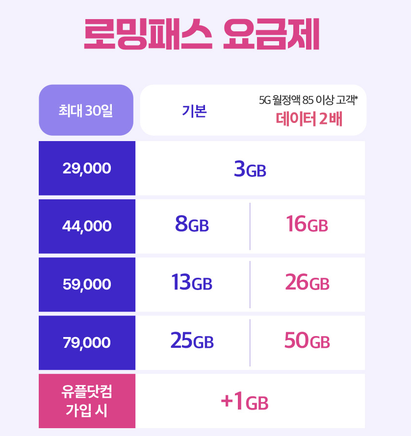 - 통화 및 문자 로밍: 기본료 없이 사용량만큼 과금 (국가마다 상이)